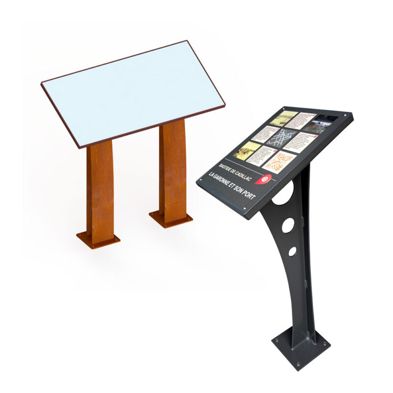 Le pupitre BOURGOGNE se compose d’un plateau monté sur un ou deux pieds modernes et design. L’ensemble est en aluminium laqué et accueille une plaque imprimée. Afin de personnaliser votre parcours de découverte, la couleur de la structure aluminium ainsi que la forme des pieds est au choix. Cette table d’interprétation s’assortie donc facilement au mobilier urbain existant afin de valoriser le patrimoine bâti d’un lieu tout en restant discret. Ce mobilier de signalétique touristique peut également servir de table d’orientation grâce aux grand formats disponibles.