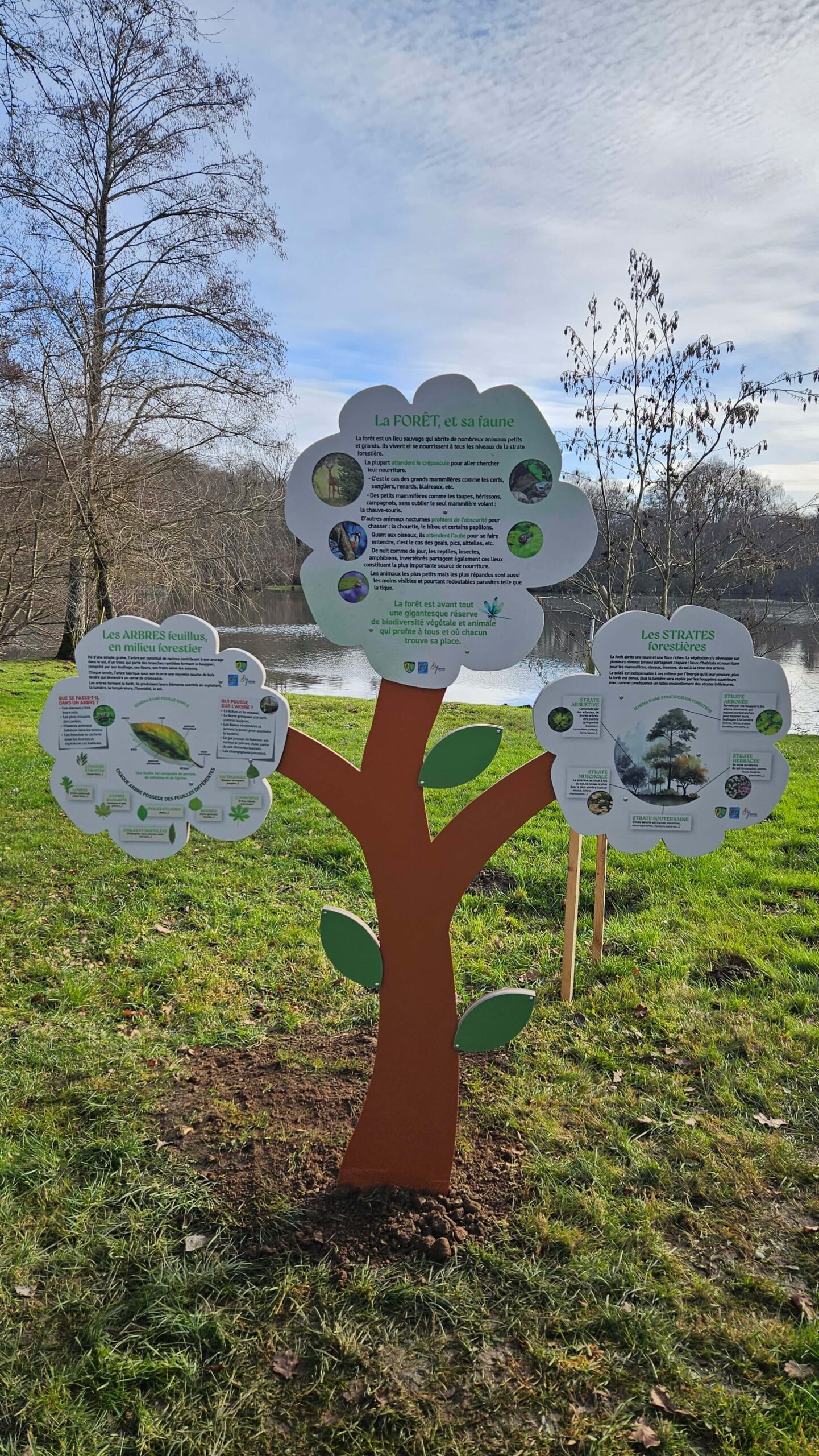 Nous avons assuré la réalisation des illustrations, la conception graphique des visuels ainsi que la fabrication de mobiliers ludiques et pédagogiques sur-mesure. Parmi ces réalisations, des supports en forme d’arbres pédagogiques proposent une lecture claire et attractive des thématiques liées à la forêt, aux sols, aux champignons et aux cycles du vivant.