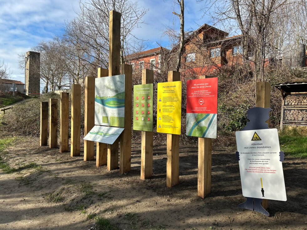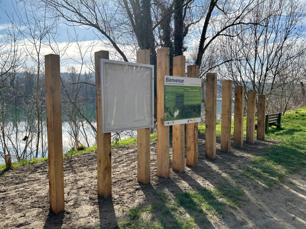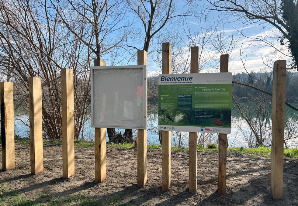AD production a fabriqué les panneaux et vitrines d’entrée de site ainsi que la signalétique des boucles de découverte de l’île de la table ronde : pupitres combinant panneau imprimé pour la carte des sentiers et mat pour les lames directionnelles, bornes directionnelles et de consignes, …