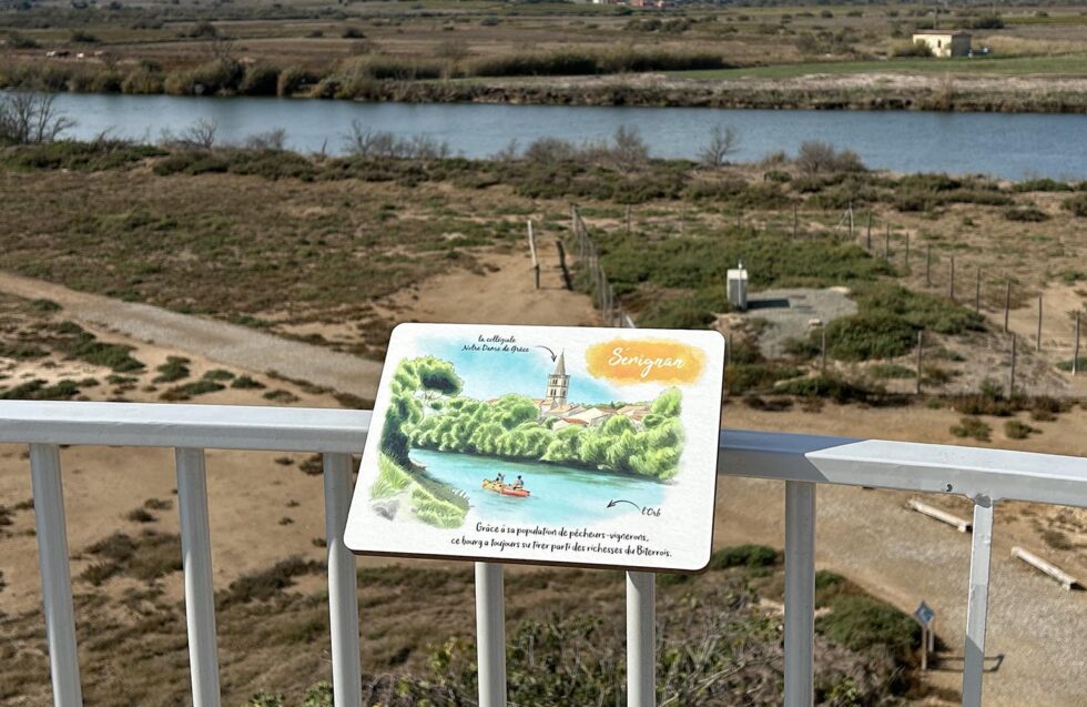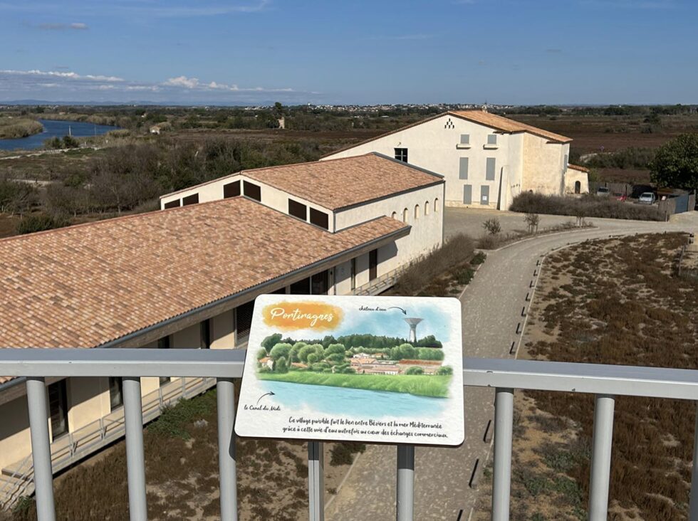 AD production a été chargé par l’Office de Tourisme de Béziers Méditerranée de créer des illustrations et panneaux pour s’orienter et permettre une bonne lecture du paysage panoramique depuis la passerelle du belvédère. Ces panneaux touristiques permettent de situer et de découvrir différentes communes ainsi que des sites naturels entourant la maison des Orpellières.